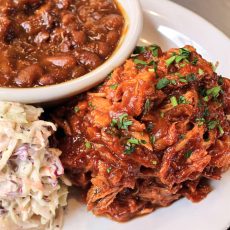 Our hand-pulled, slightly sweet BBQ beef with rustic rolls from Zingerman’s Bakehouse. We send along Molasses Baked Beans (contains bacon) and coleslaw.